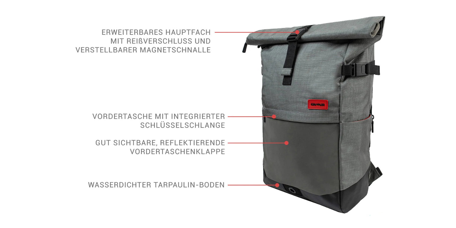 Sein wasserdichter Tarpaulin Boden und langlebiges, wasserabweisendes Nylon schützen deinen Rucksack und seinen Inhalt vor Nässe, die gut sichtbare, reflektierende Fronttasche schützt dich durch erhöhte Sichtbarkeit im Straßenverkehr.